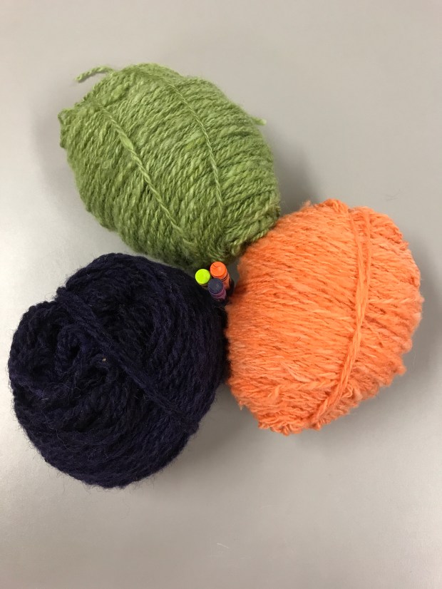 Louise O. managed to pull some pretty fantastic colours from the crayon bag and after weaving several scarves, took to a needle and thread.